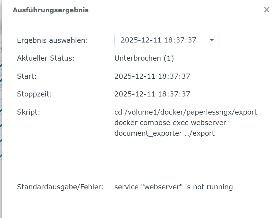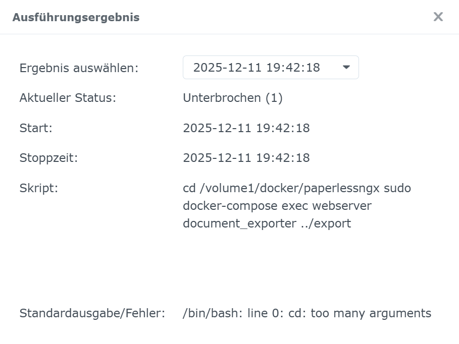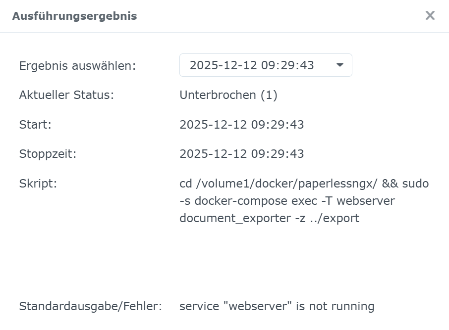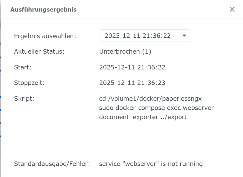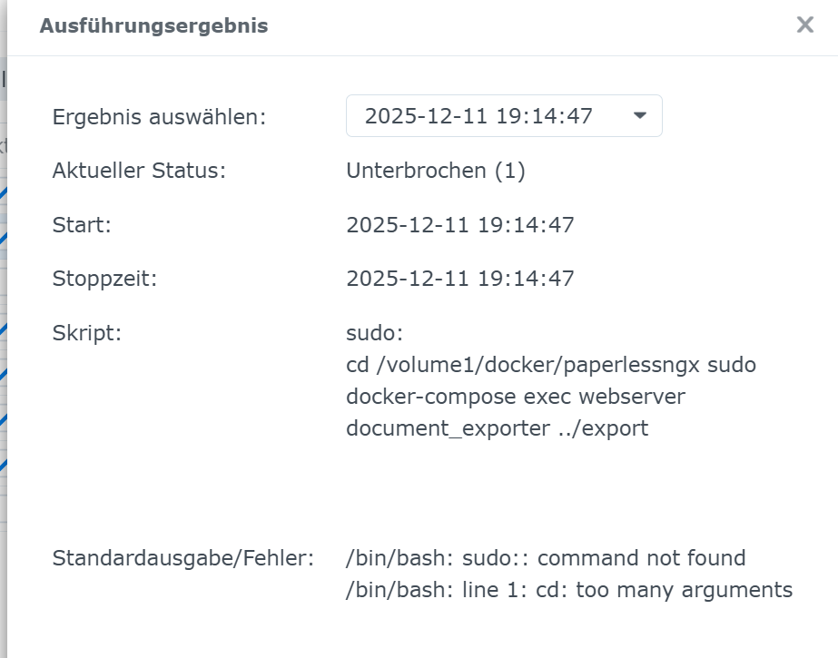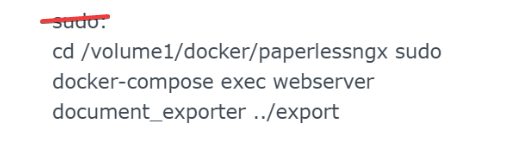 cd /volume2/docker/paperless-ngx/ && sudo -s docker-compose exec -T webserver document_exporter -z ../export