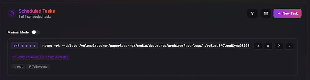 Habe paperless-ngx nach der Masterclass eingerichtet. Im docker habe ich dann einen Ordner cronmaster angelegt und dann dazu die Unterordner scripts,data und snippets angelegt. In der docker-compose.yml die Pfade noch angepasst ( /volume1/docker/cronmaster/scripts … ) Mit sudo docker compose up -d cronmaster gestartet. Läuft einwandfrei um mein script für ein Backup von Paperless zu starten.