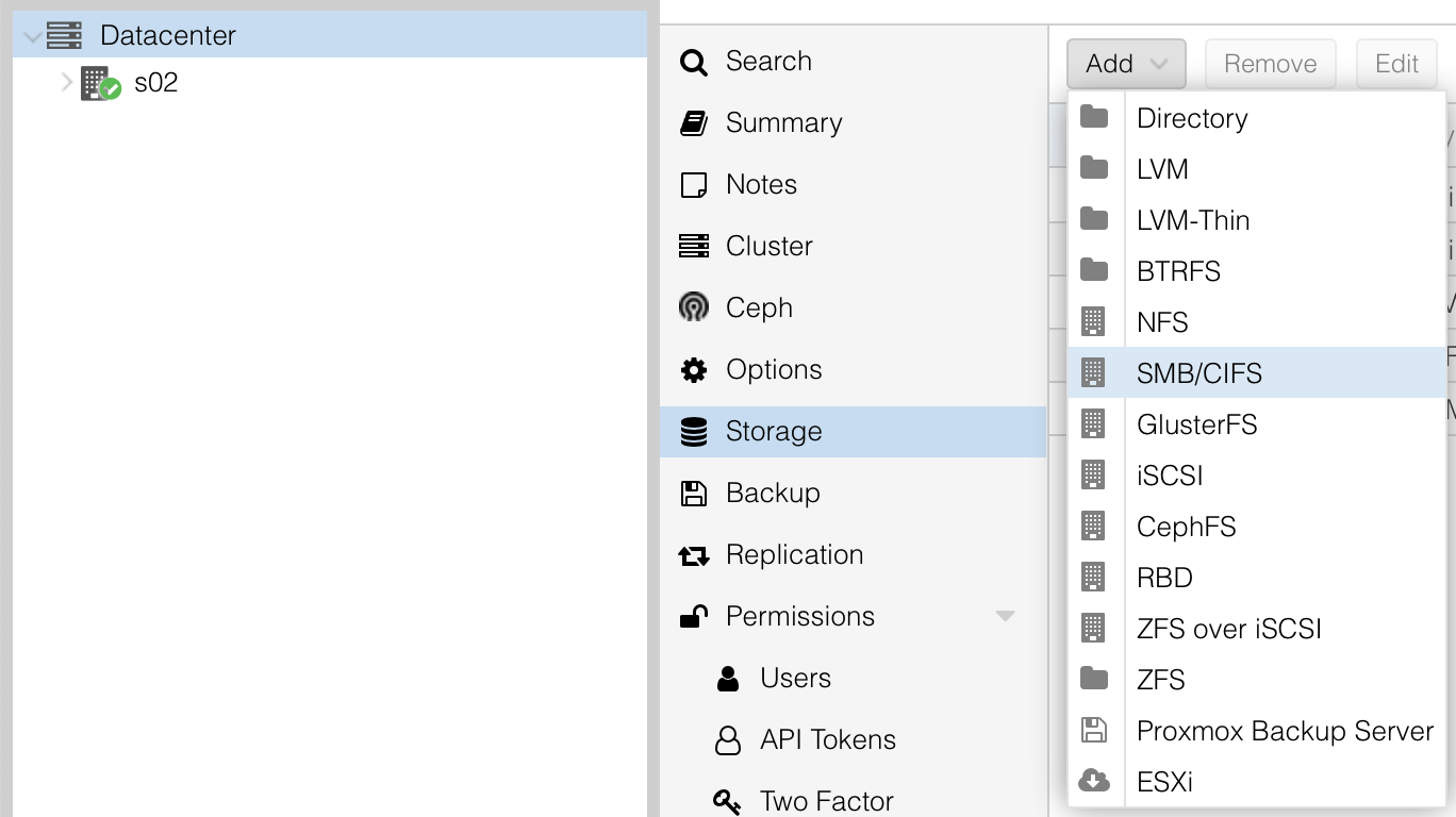 Dazu gehst du unter Datacenter > Storage und fügst dein Ziel-NAS als Storage hinzu:
