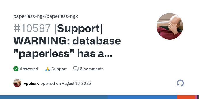 paperless-db-1 | 2025-08-23 09:58:48.186 UTC [48] WARNING: database "postgres" has a collation version mismatch