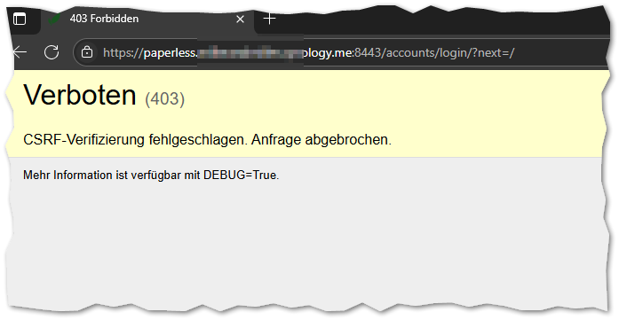 Leider bekomme ich NACHDEM ich mich bei Paperless anmelden will, die allseits bekannte Fehler Meldung „CSRF Verifizierung fehlgeschlagen“. Ich habe jetzt schon verschiedenste Lösungsmöglichkeiten probiert, in der ENV Datei den Port angegeben, https weggelassen, Einträge wie „allowed Hosts“ hinzugefügt, etc… Leider immer mit dem gleichen Ergebnis.