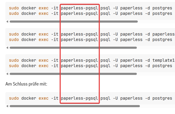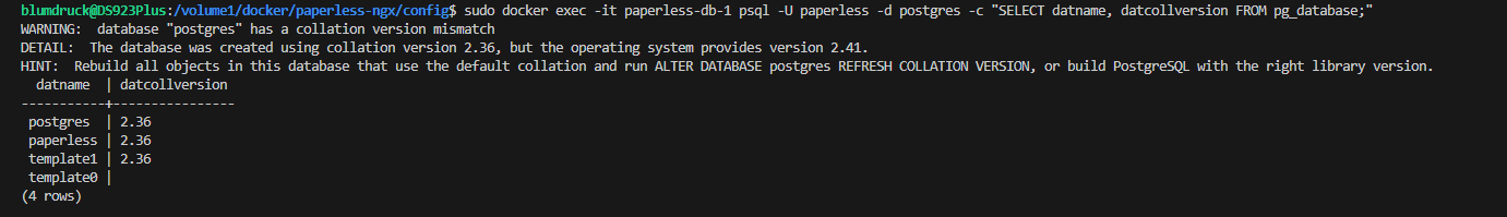 ER DATABASE paperless REFRESH Cblumdruck@DS923Plus:/volume1/docker/paperless-ngx/config$ sudo docker exec -it paperless-pgsql psql -U paperless -d postgres -c „ALTER DATABASE paperless REFRESH COLLATION VERSION;“