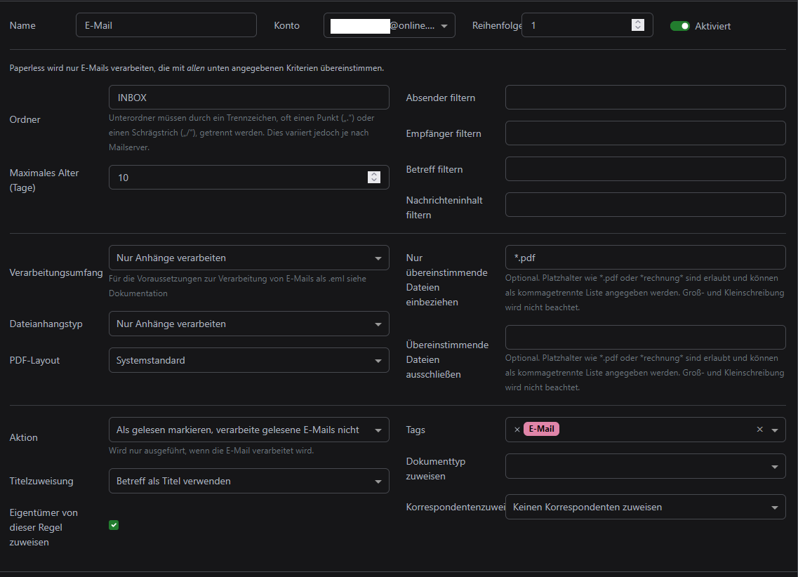 Meine E-Mail-Regel sieht wie folgt aus: