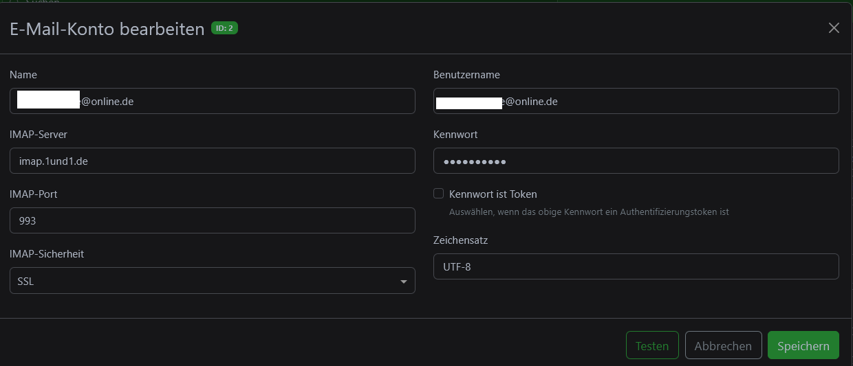 Ich richte mein IMAP (dieses liegt bei 1und1) Konto ein und der Test klappt auch. Also ist die kommunikation „nach draußen“ schon mal gegeben.