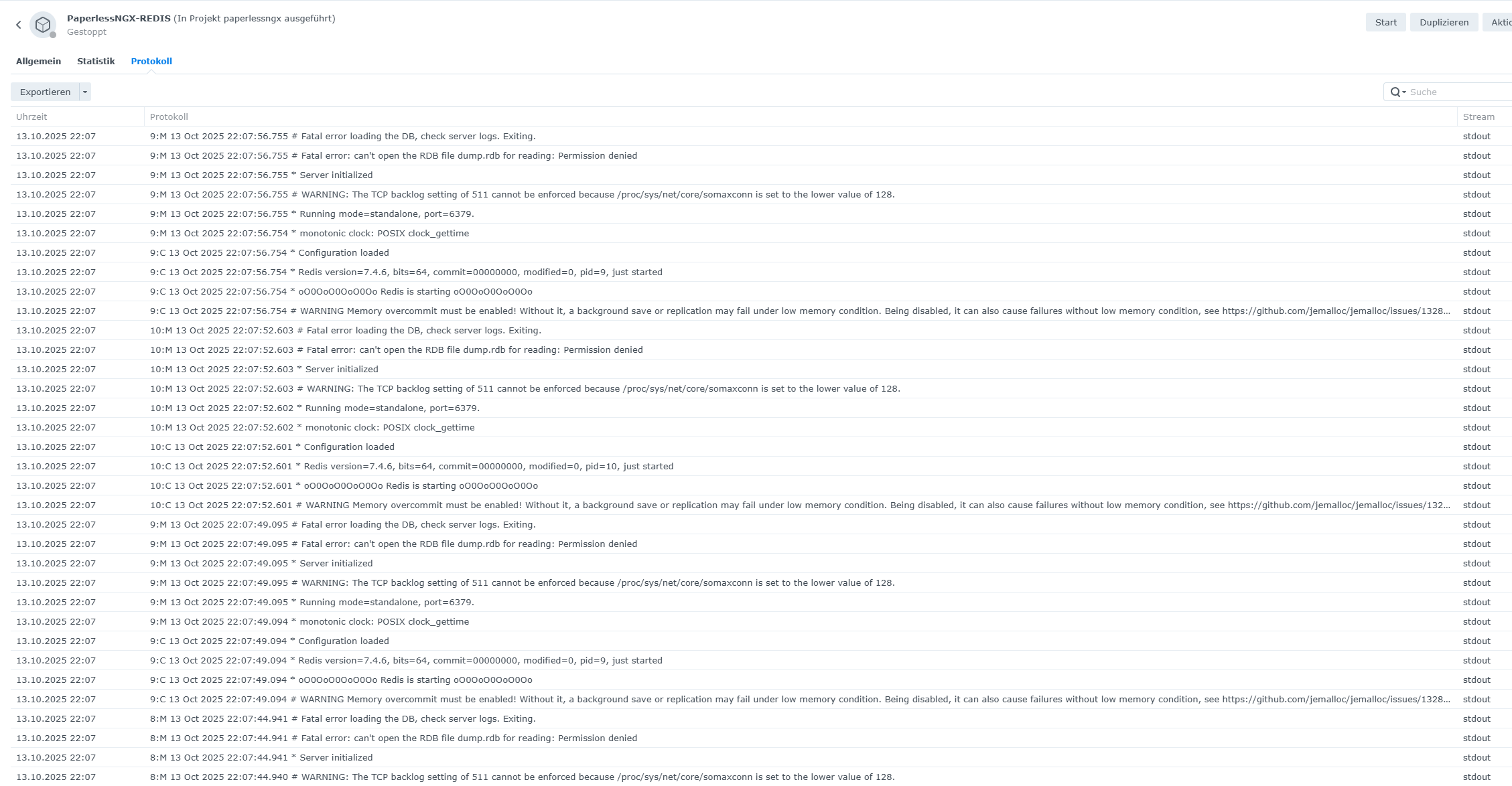 Würde mal das Projekt im Container-manager Projekt stoppen und bereinigen.
