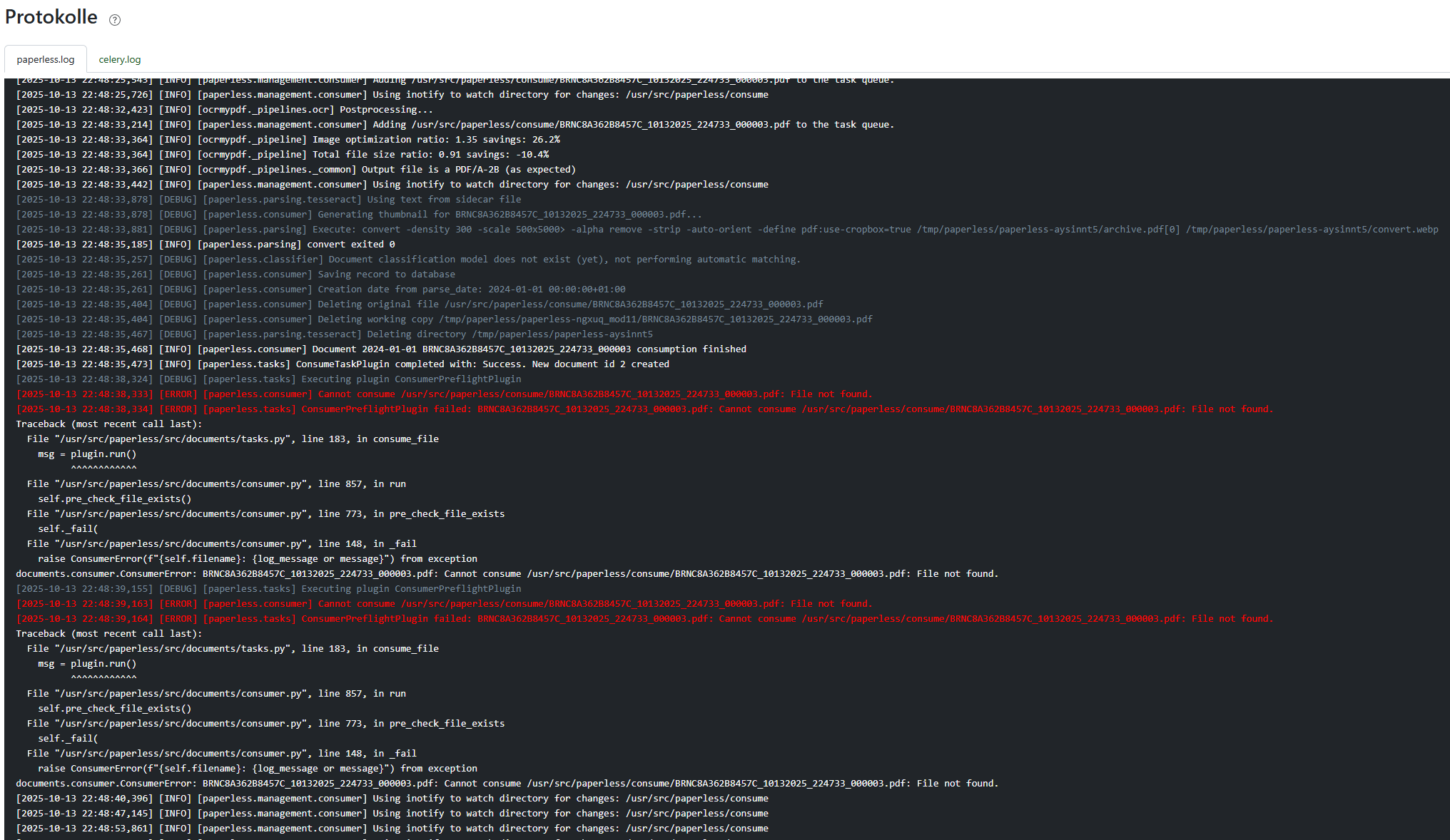 Kannst das Dokument mal lokal speichern und manuell in den Consumer Ordner legen, nur um zu sehen ob es am Scanner liegt.