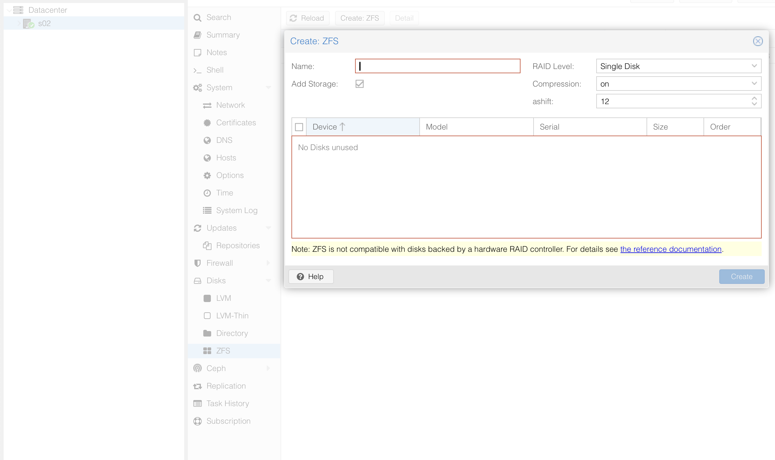 Ich bin wie folgt vorgegangen: Ich habe mir unter Disks/ZFS/Erstellen: ZFS einen Mirror aus den beiden NVME‑Speicherriegeln erstellt.