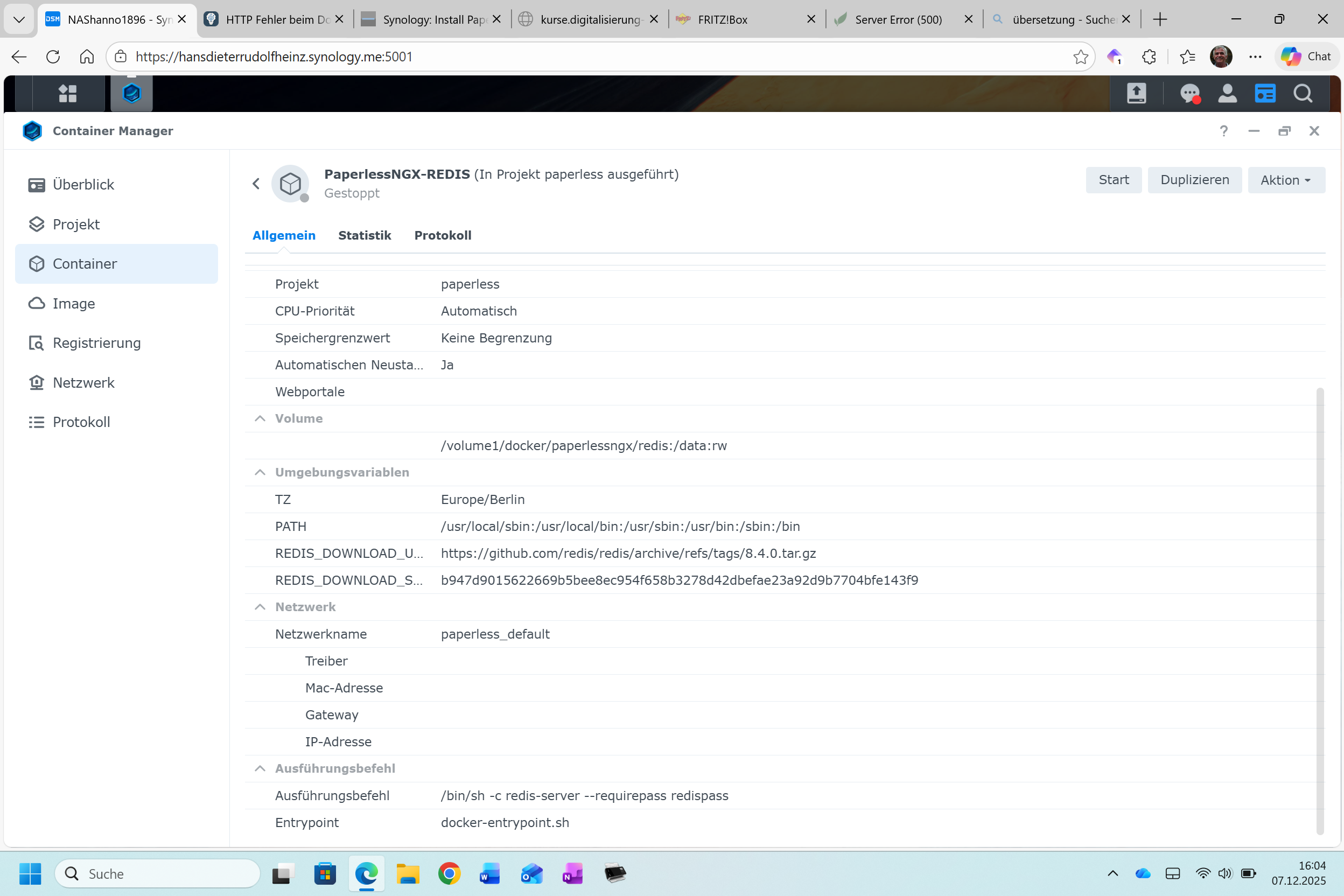 Dann die Container erstellen, nach der Anleitung vom Stefan oder du machst dir im Containermanager ein neues Projekt, gibst den Pfad an wo die docker-compose liegt, überspringst die Einstellung fürs WEB und Paperless sollte nach ein paar Minuten laufen.