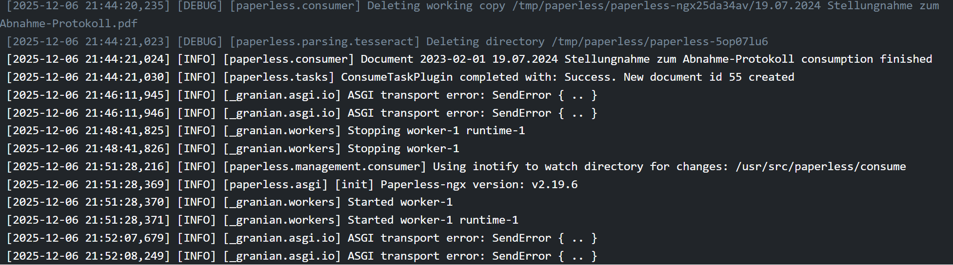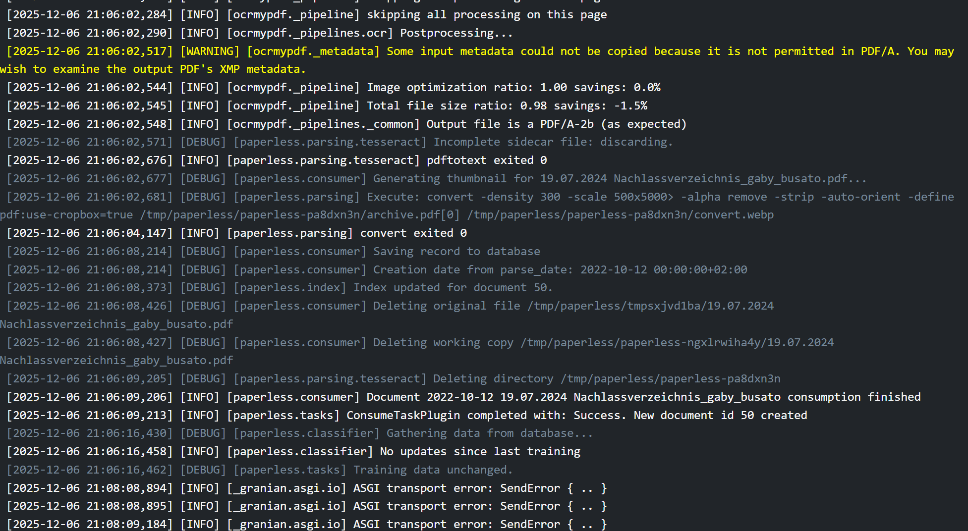 Wenn ich Paperless stoppe und wieder starte, dann kann ich Dokumente hochladen. Das geht aber nur einmal und dann muss ich den Vorgang wiederholen.
