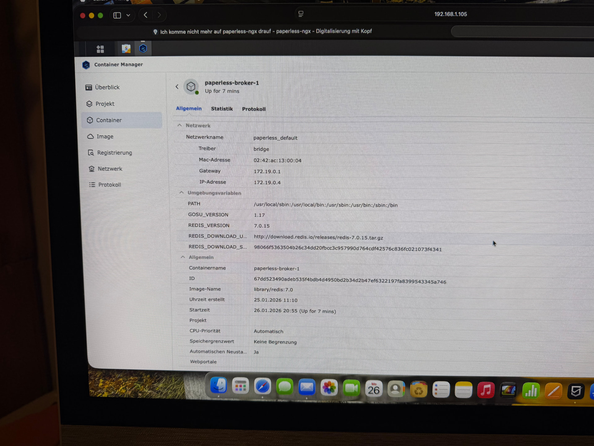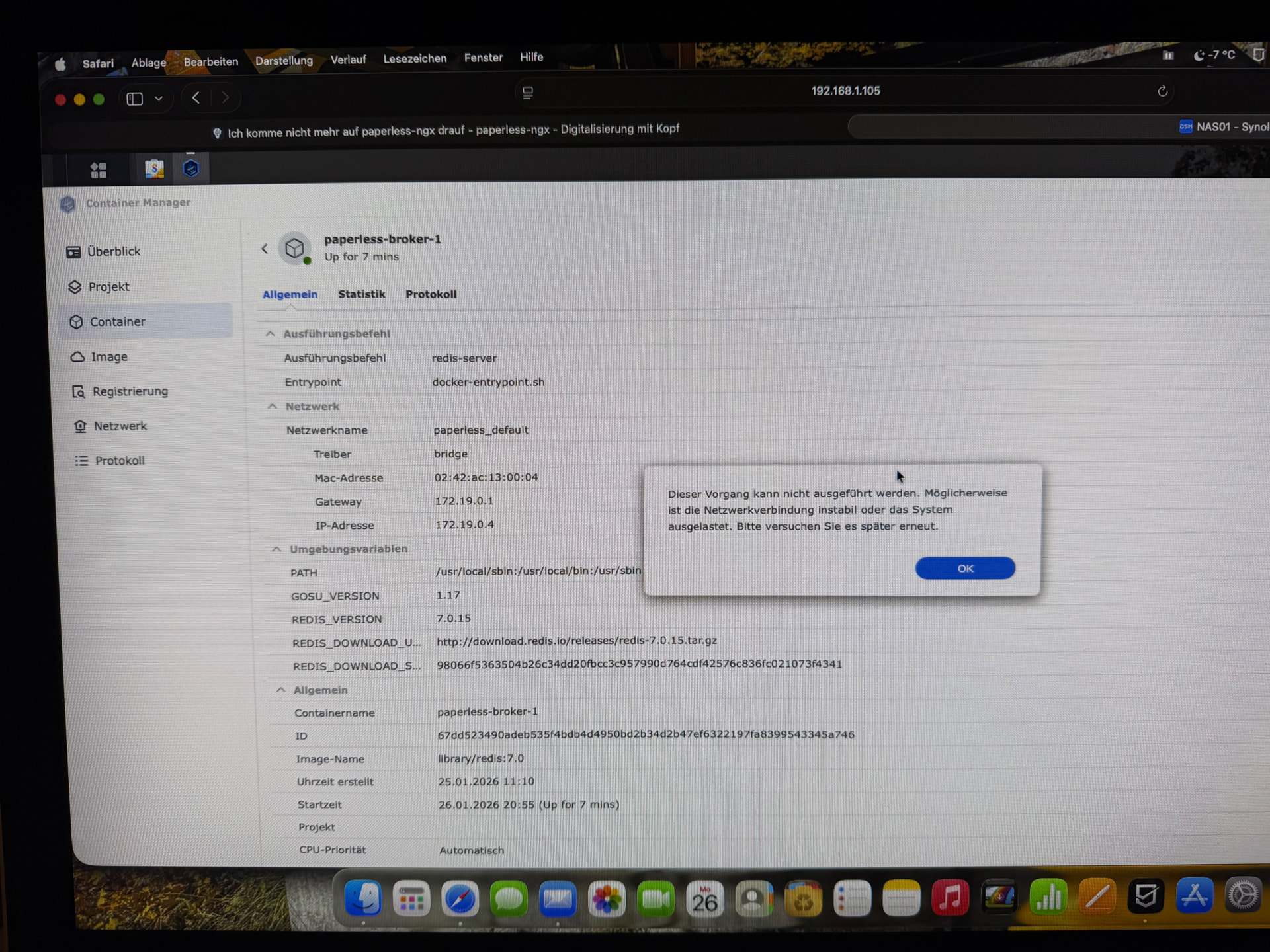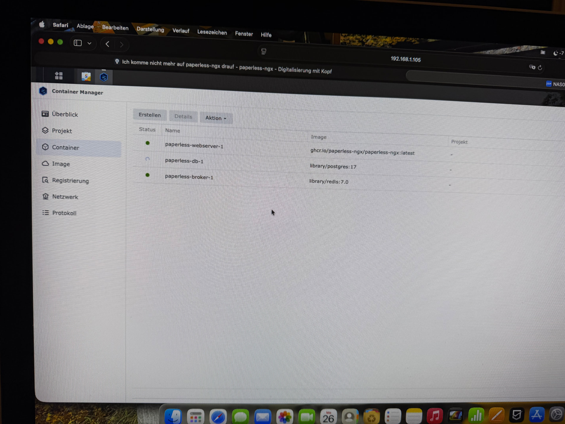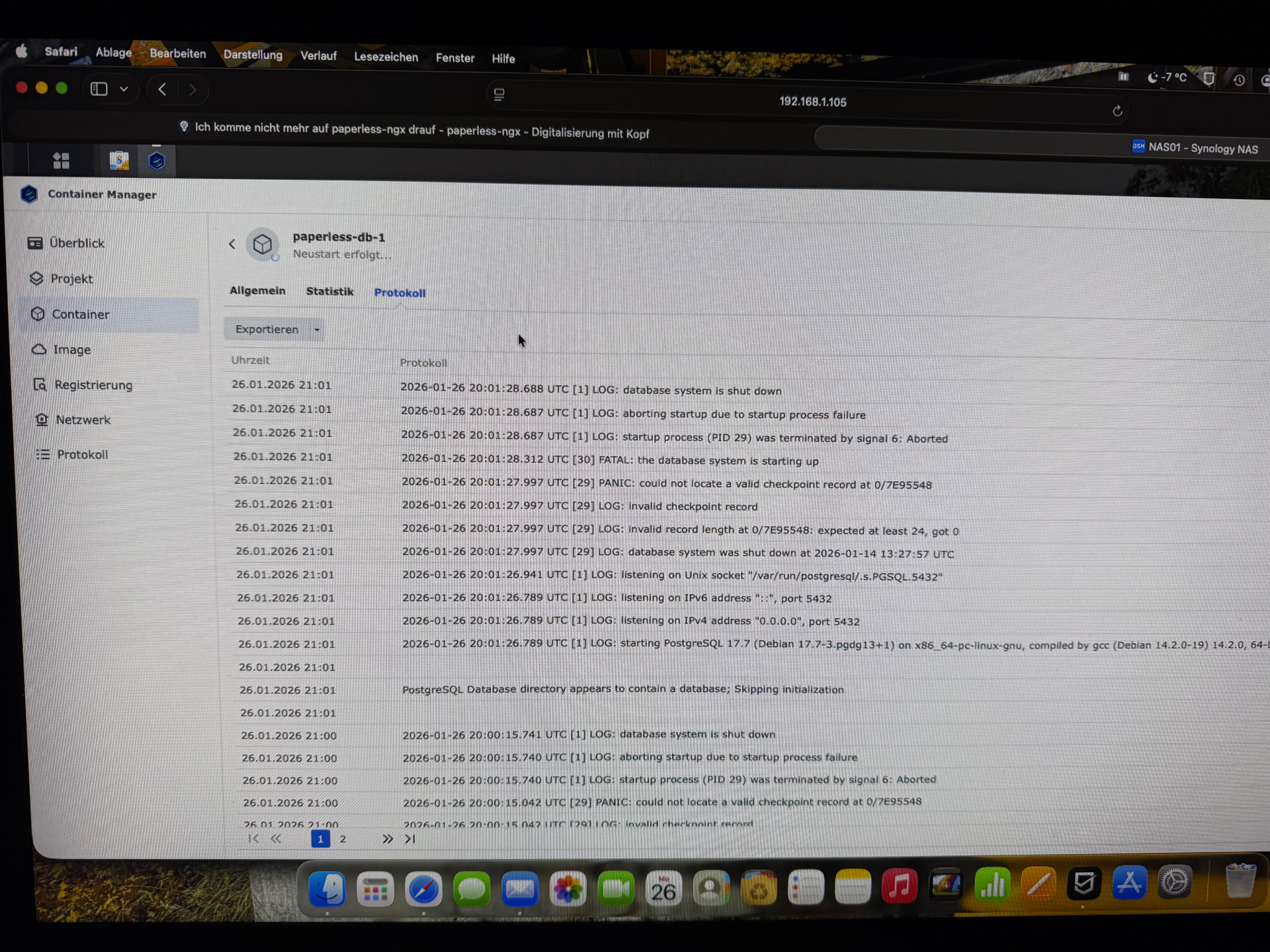Laut den Bildern kommt der Datenbank Container und der Paperless Container nicht hoch. Ich tippe auf Problem mit der Datenbank und deswegen geht auch Paperless nicht.