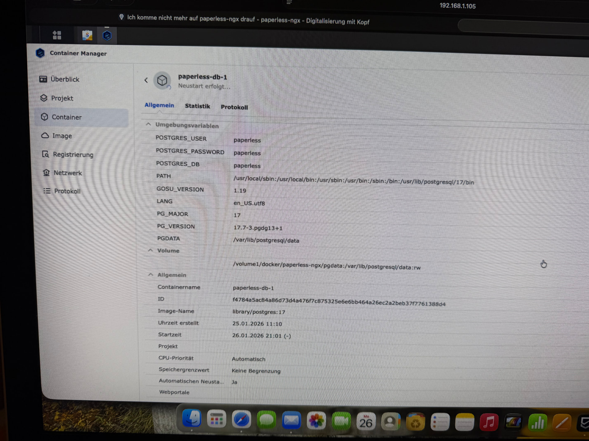 Da ja in allen Anweisungen der Composer Files immer auf latest gesetzt wird tippe ich auf Download von PostgreSQL 18 nach löschen des letzten DB Containers. Ein Container Log könnte helfen, dazu müsste man aber wissen was man macht. Da sehe ich hier Probleme. Kann man in der tollen WebGui nicht die Container Logs sehen?