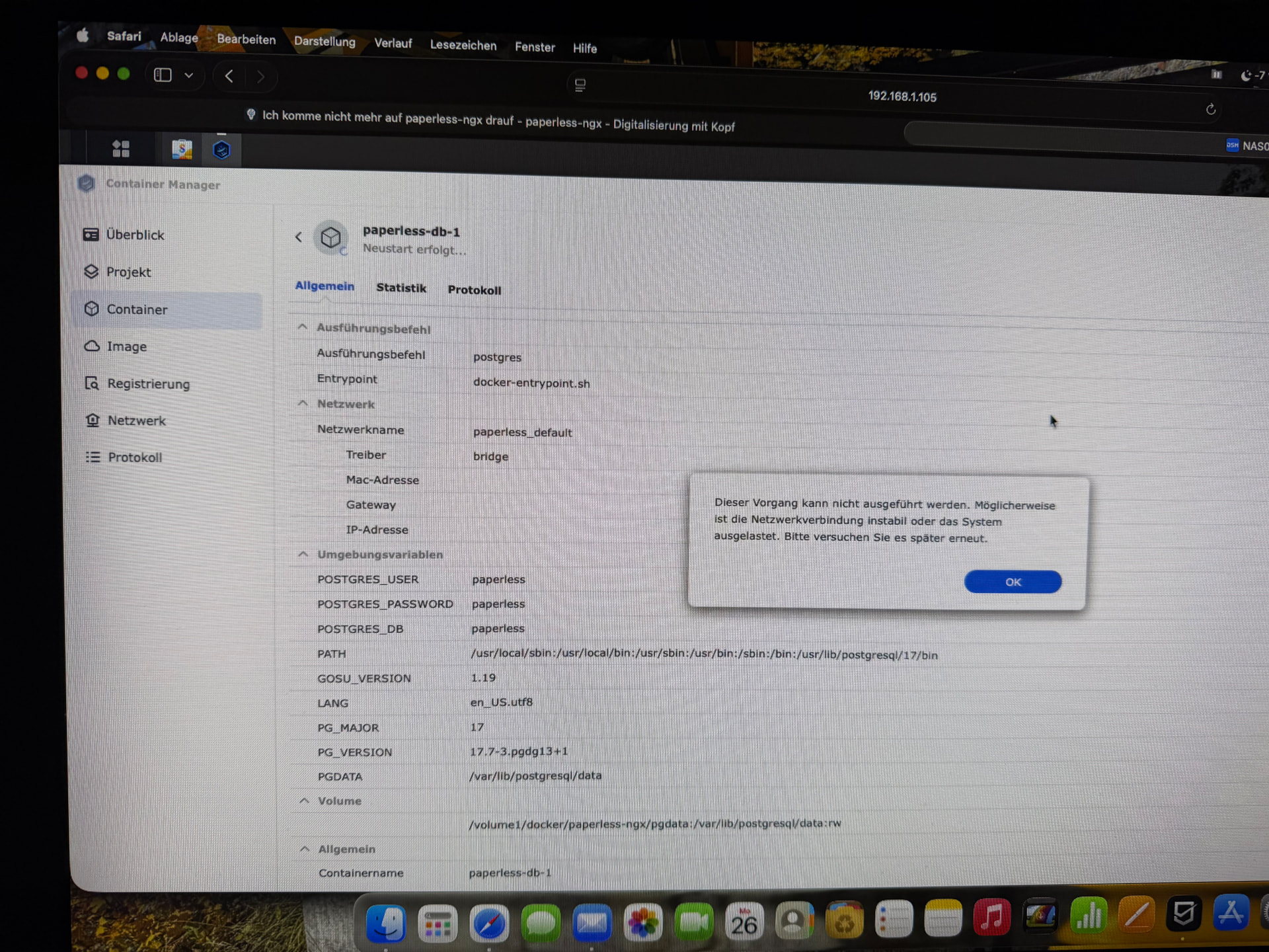 Der Conteiner mit library/postgress:17 Kommt und geht er ist nicht stabil.