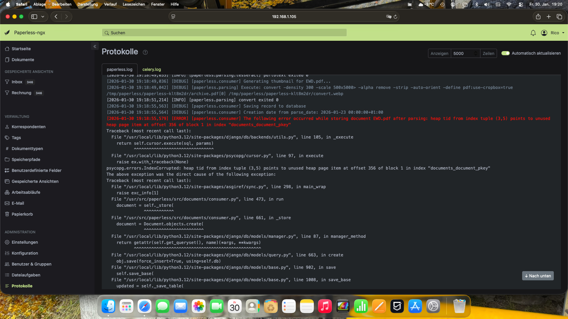 [2026-02-03 13:36:09,809] [ERROR] [celery.app.trace] Task documents.tasks.consume_file[6fa285fa-a6a9-498e-a2b7-06ef381973f8] raised unexpected: ConsumerError('Unilabs.pdf: The following error occurred while storing document Unilabs.pdf after parsing: heap tid from index tuple (3,5) points to unused heap page item at offset 356 of block 1 in index "documents_document_pkey"')