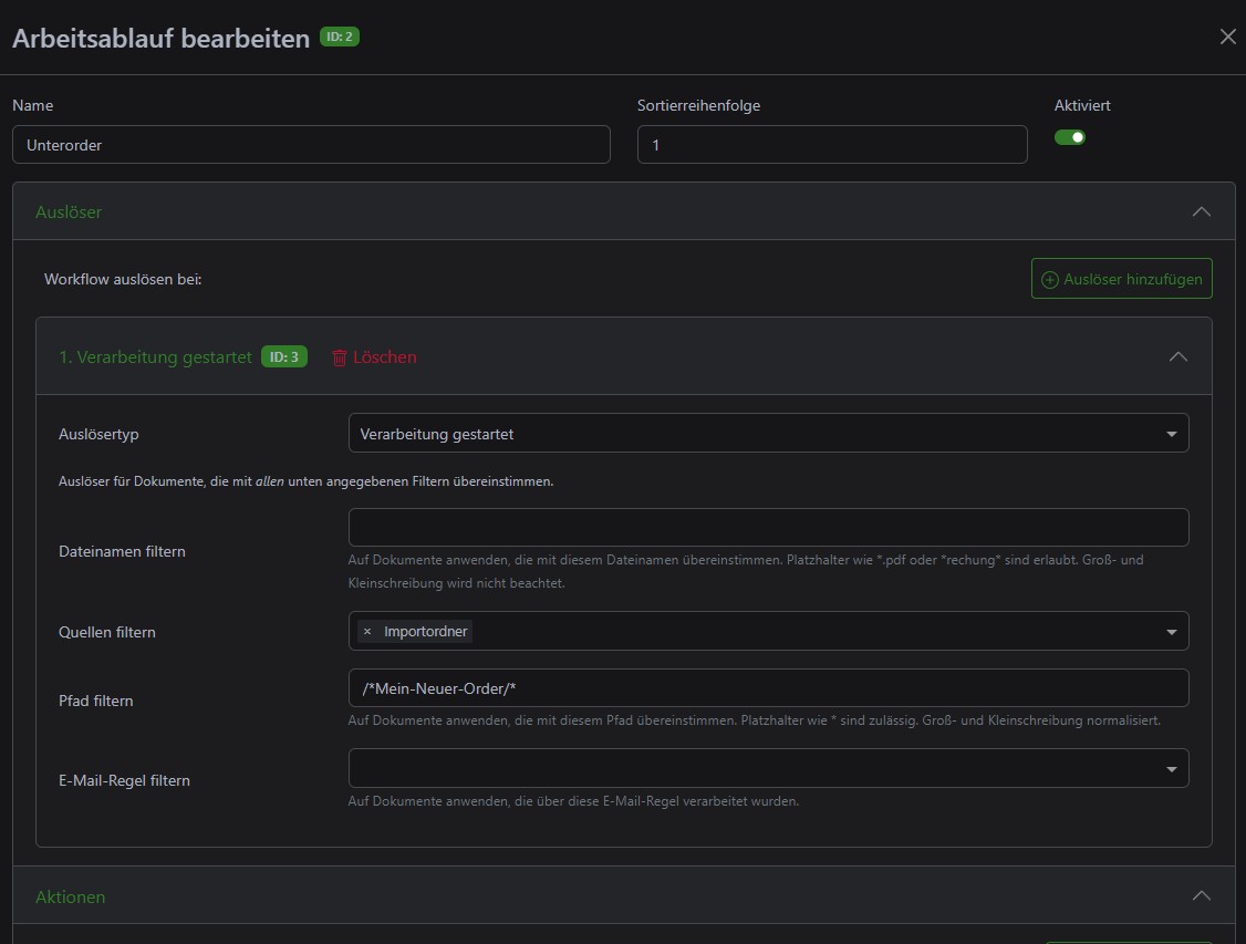 Paperless-ngx kann mit der Option PAPERLESS_CONSUMER_SUBDIRS_AS_TAGS (in Verbindung mit PAPERLESS_CONSUMER_RECURSIVE) Tags aus Unterordnern im Consume-Verzeichnis erstellen. Packe ich also eine Datei in einen Unterordner mit dem Gesamtpfad „consume/subst-user1/test.pdf“, erstellt Paperless daraus eine Datei test.pdf mit dem Tag „subst-user1“. Das geht leider nur mit Tags, nicht mit Dokumententypen oder Besitzern. ABER: Über die „Arbeitsabläufe“ in der Web UI kann man einen Ablauf bauen, der nach dem Hinzufügen eines Dokuments aktiv wird und einen Pseudo-Tag durch einen neuen Besitzer ersetzt. So ein Workflow muss zwar für jeden Benutzer mit Unterordner erstellt werden, aber bei ein paar Leuten ist das recht überschaubar. Der Workflow sieht dann ungefähr wie folgt aus: