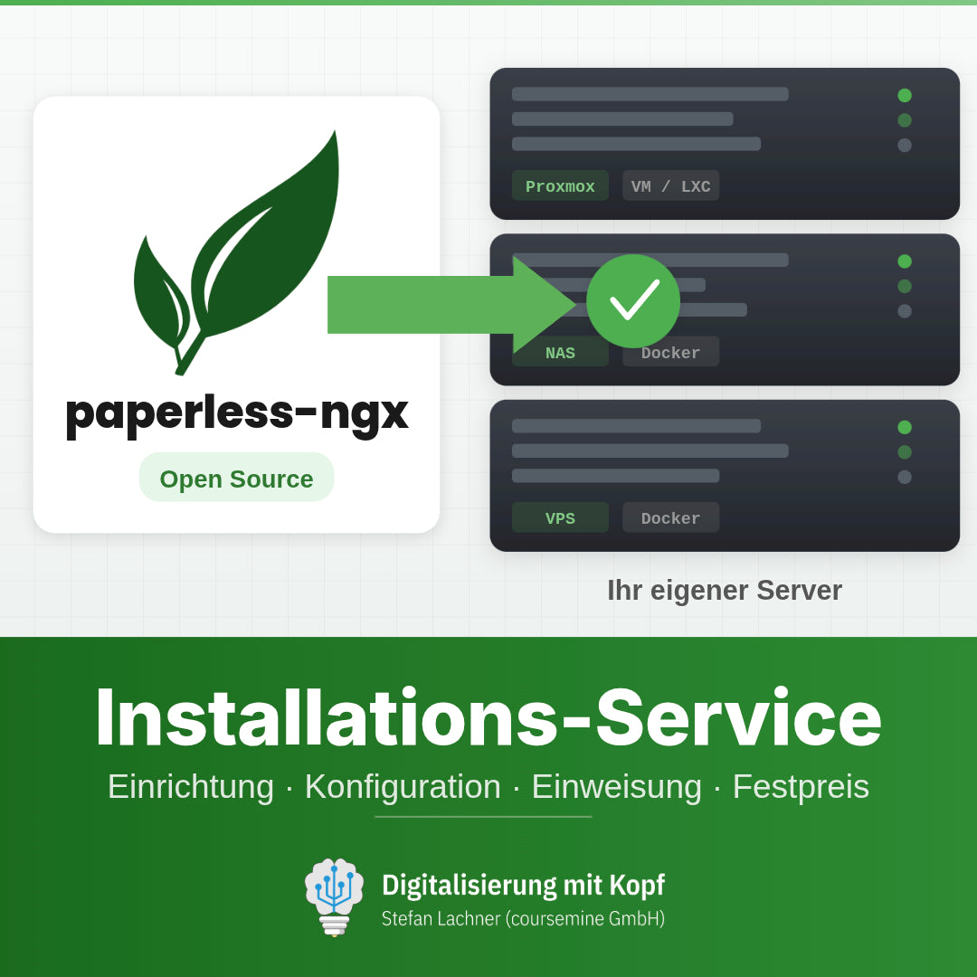 für alle, die paperless-ngx oder auch Nextcloud gerne auf ihrer eigenen Hardware (Synology-NAS, UGREEN-NAS, virtueller Server bei Hetzner, IONOS und Co.) laufen lassen wollen, aber die Installation und Absicherung scheuen, haben wir jetzt unsere Festpreis-Pakete im Shop verfügbar:
