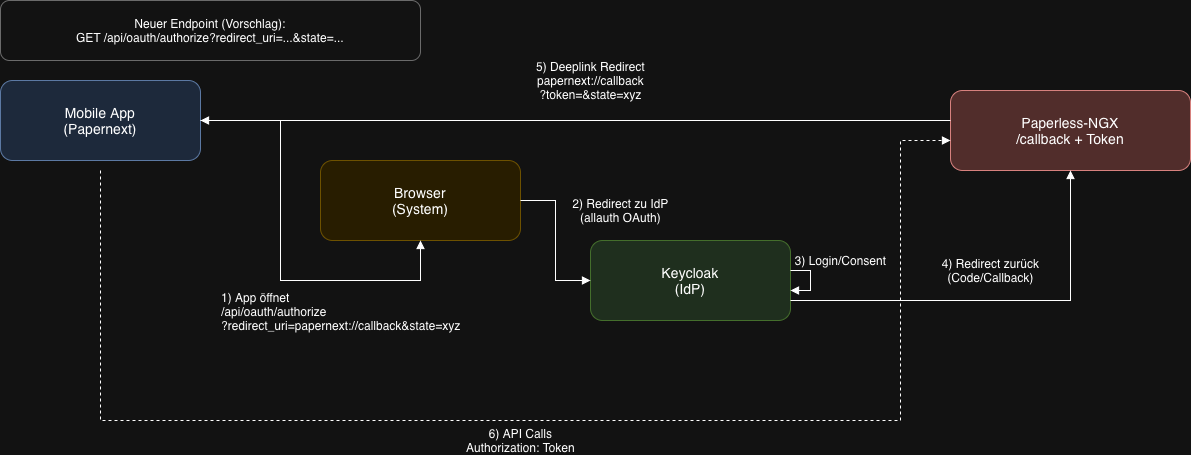 Der aktuelle OAuth-Login in paperless-ngx endet in einer Web-Session, nicht in einem API-Token. Für externe Clients (Mobile App, CLI) fehlt damit die Token-Ausgabe.
