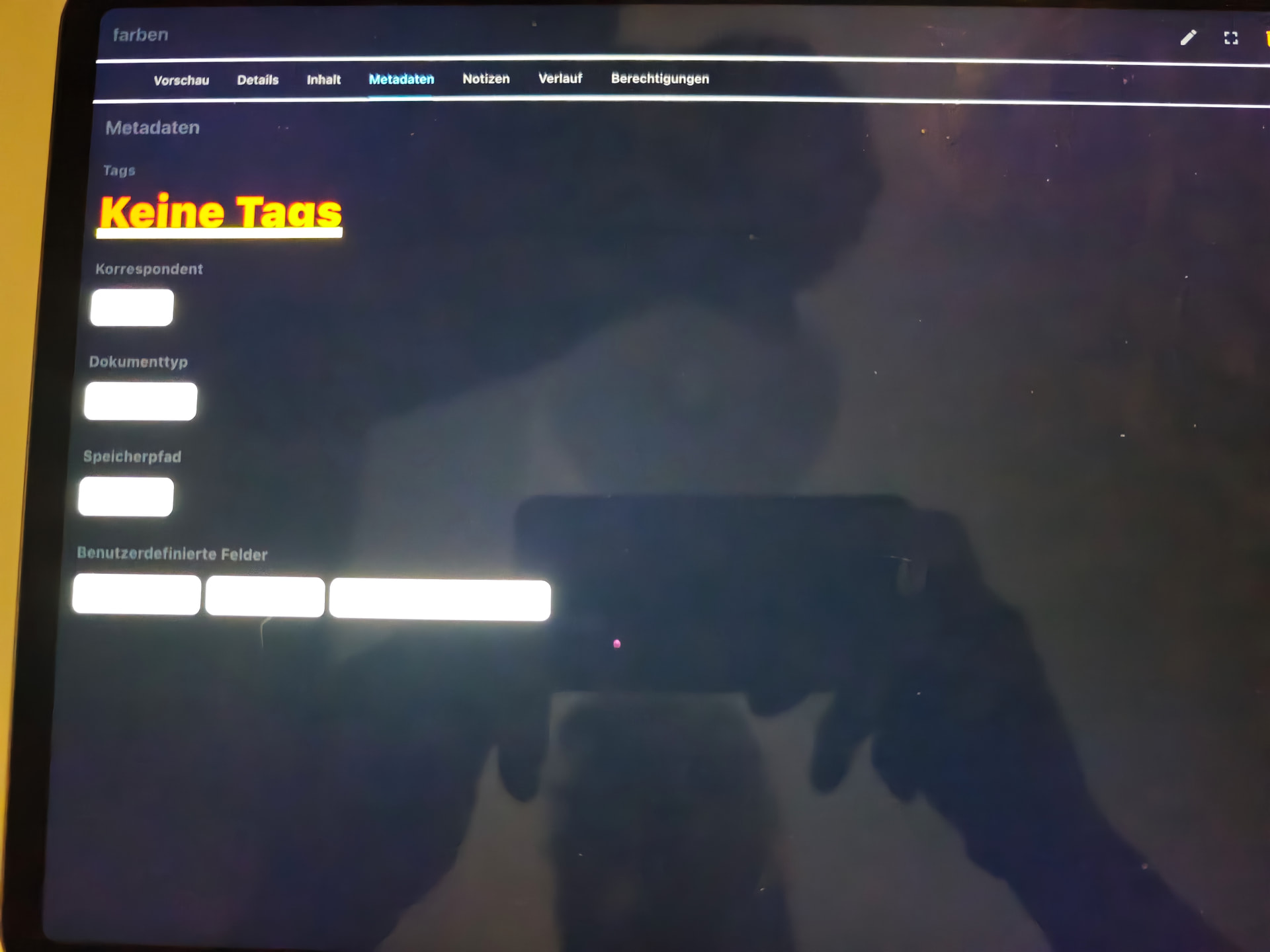Vorher hatte ich auch einen weißen Hintergrund. Jetzt ist er schwarz. Ich komme aber auch nicht mehr zurück zum Startmenü. Hatte nur die Metadaten aufgerufen weil wenn kein Tag ausgewählt dann erscheint keine Tags sehr groß. Das ganze passiert aber nur wenn ich etwas geändert habe und dann auf speichern gehe. Muss jetzt die App schließen und wieder aufrufen und dann ist alles wieder in Ordnung. Installierte Version 0.5.9 (106)