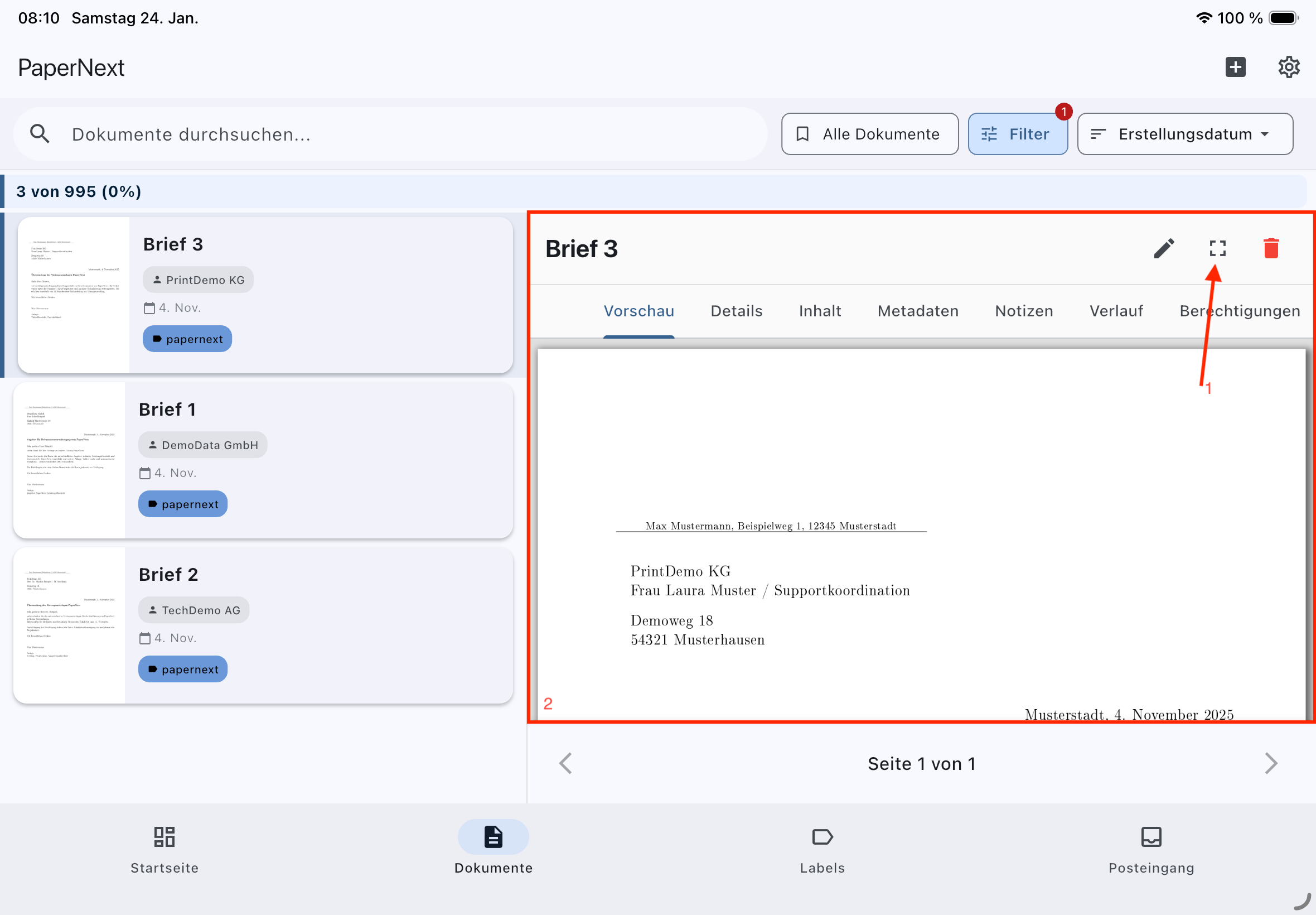 Habe jetzt auf einem Apple Tablet getestet. Habe auf der linken Seite die Vorschau der Dokumente. Wenn ich nun das Dokument bearbeite und speichere dann erscheint das Dokument in Groß in der rechten Ecke sehe ich Bearbeiten und den Papierkorb die Schrift ist in Grau gehalten auf schwarzem Hintergrund. In der nächsten Zeile sehe ich den reiter Vorschau in einem schwachen Blau auf schwarzen hintergrund. Die restlichen Reiter sind in einem grau. Auch alle Informationen in den Reitern sind leider nicht zu lesen (schwarzer Hintergrund) Mein Problem ist aber wie komme ich aus der Dokumenten Vorschau wieder in das Hauptmenü der Dokumente ?