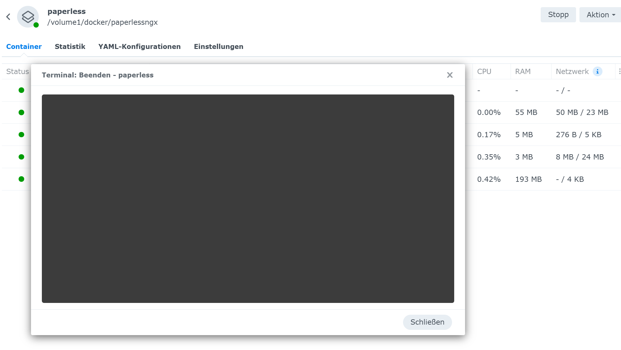 Fahr Paperless mal via SSH mit “sudo docker-compose down” herunter und guck ob der Container weiterhin online ist im Container-Manager.