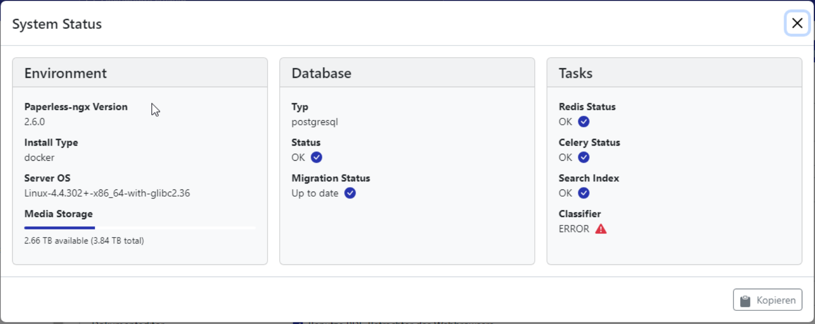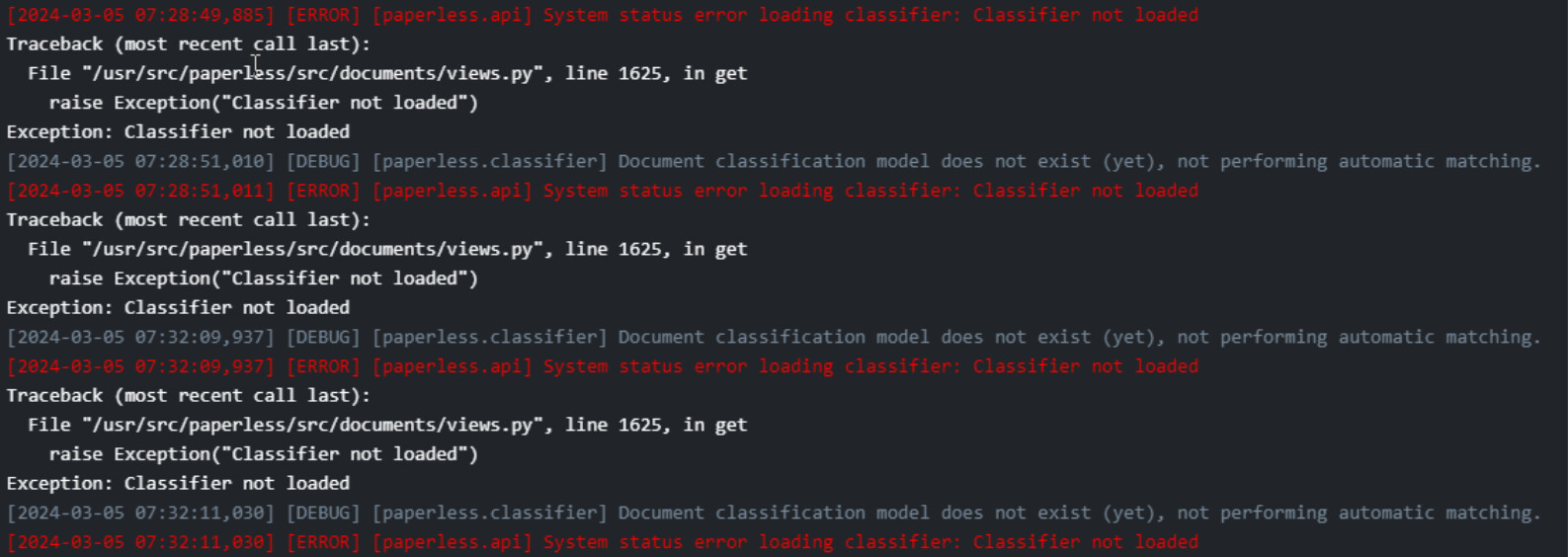 [2024-03-05 10:20:58,015] [ERROR] [paperless.api] System status error loading classifier: Classifier not loaded