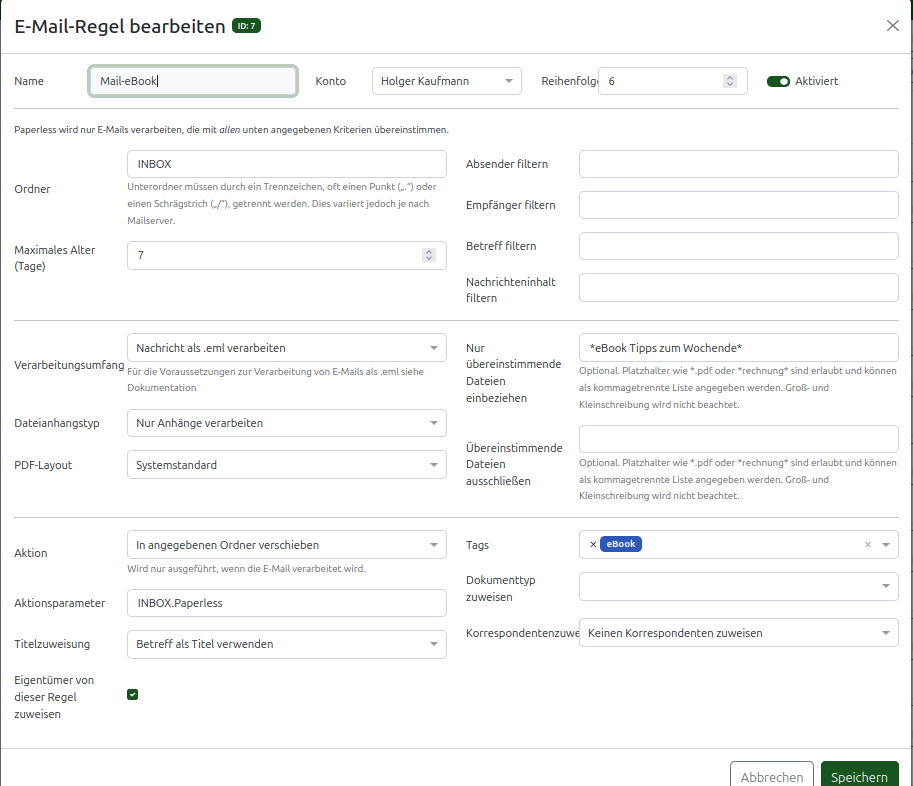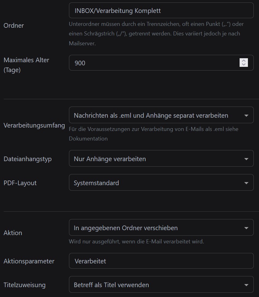 Ich habe 2 Ordner im Posteingang. Ordner 1 ist nur für PDF, das heißt es wird nur der Anhang übernommen. Ordner 2 ist für die Email und dem Anhang. Ich brauche nicht jede Email die ich erhalte. In den Email-Regeln habe ich für Email+Anhang das so eingestellt das dort ein benutzerdefiniertes Feld für Dokumentenverknüpfung hinzugefügt wird. Nach erfolgreicher Übernahme ins Paperless werden die Emails dann in einen bestimmten Ordner verschoben. (ist zur Zeit noch zur Sicherheit)