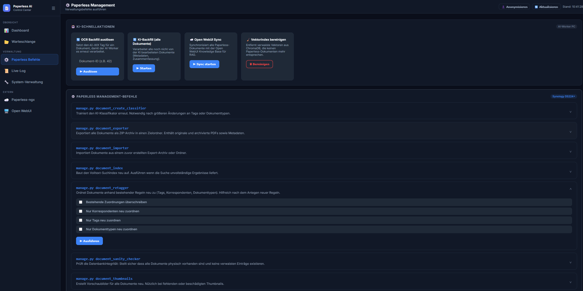 sanity_checker,document_retaggeroderdocument_exporter) direkt aus der Web-UI starten. Diese werden sicher per SSH innerhalb des Docker-Containers auf der Synology ausgeführt. -