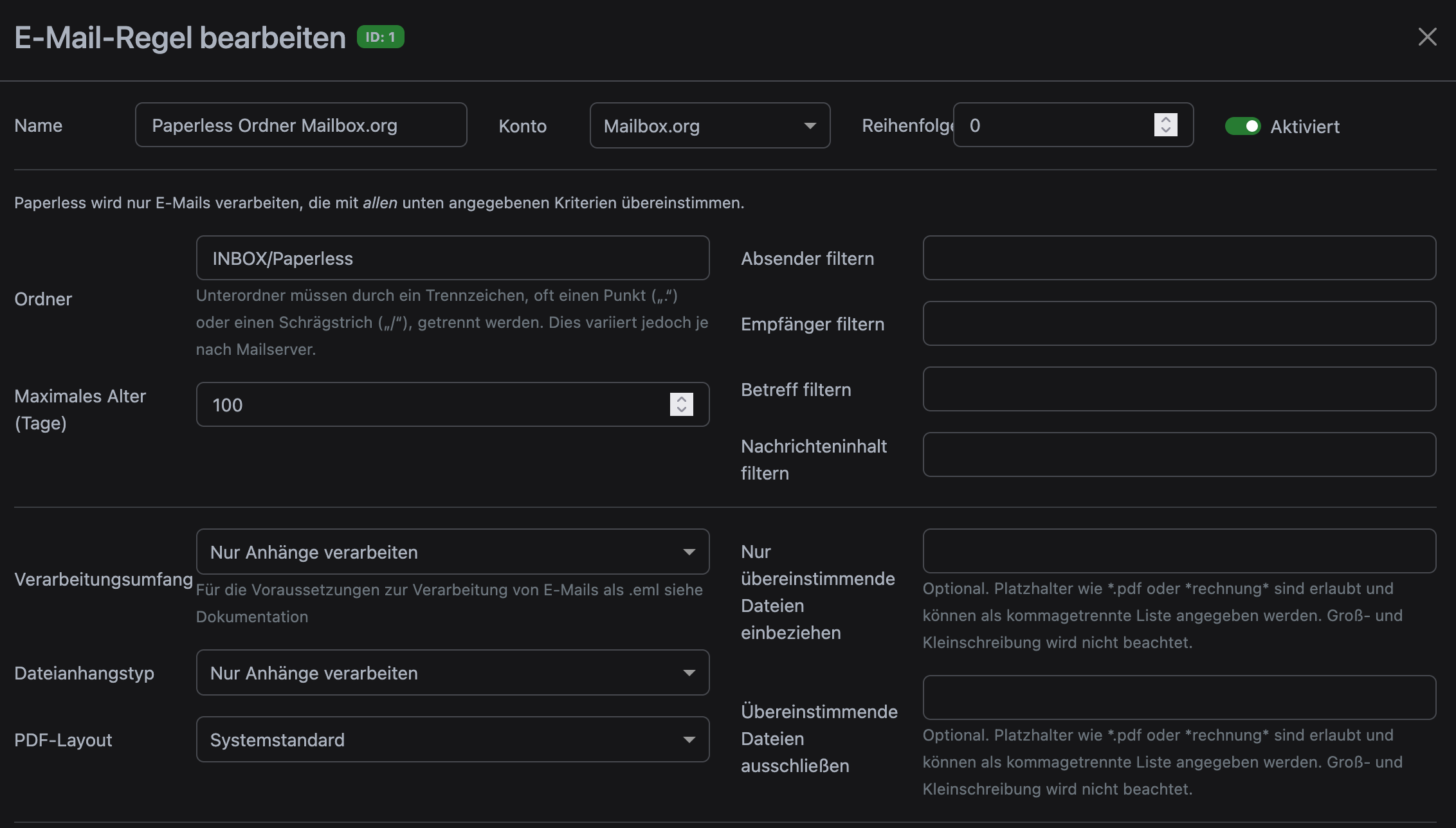 ich habe mir erfolgreich paperless-ngx auf meiner Synology eingerichtet. Jetzt wollte ich einen automatischen Workflow einrichten, so dass alle Emails aus meiner mailbox.org Inbox in paperless eingelesen werden. Hierfür habe ich mir den Unterordner INBOX/Paperless angelegt.