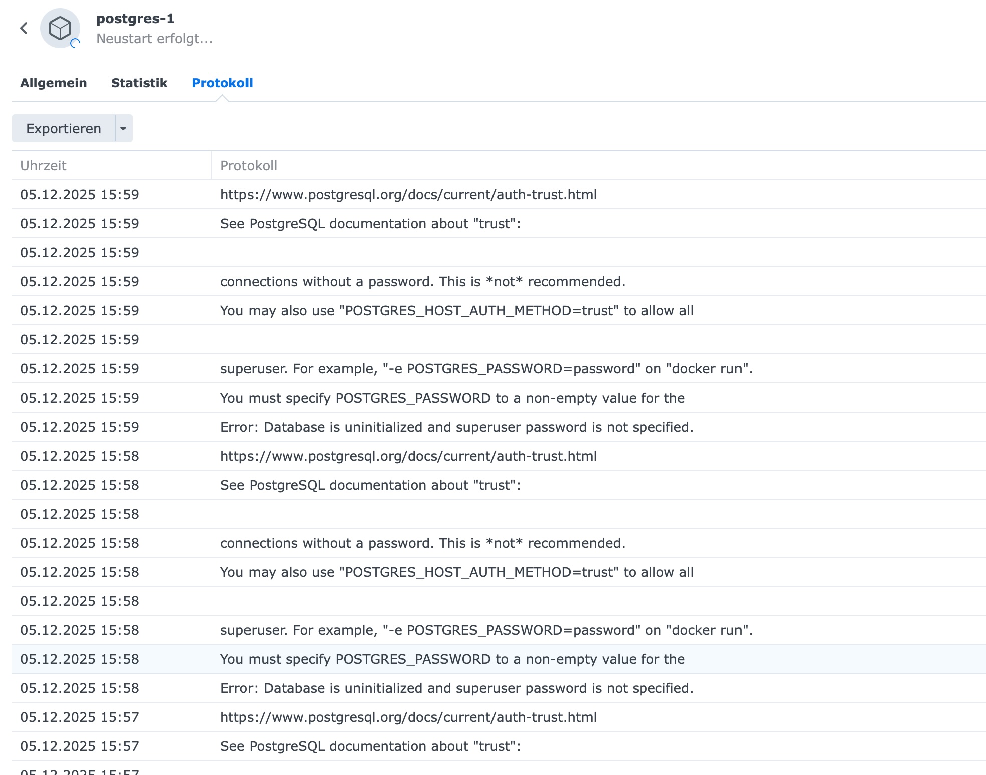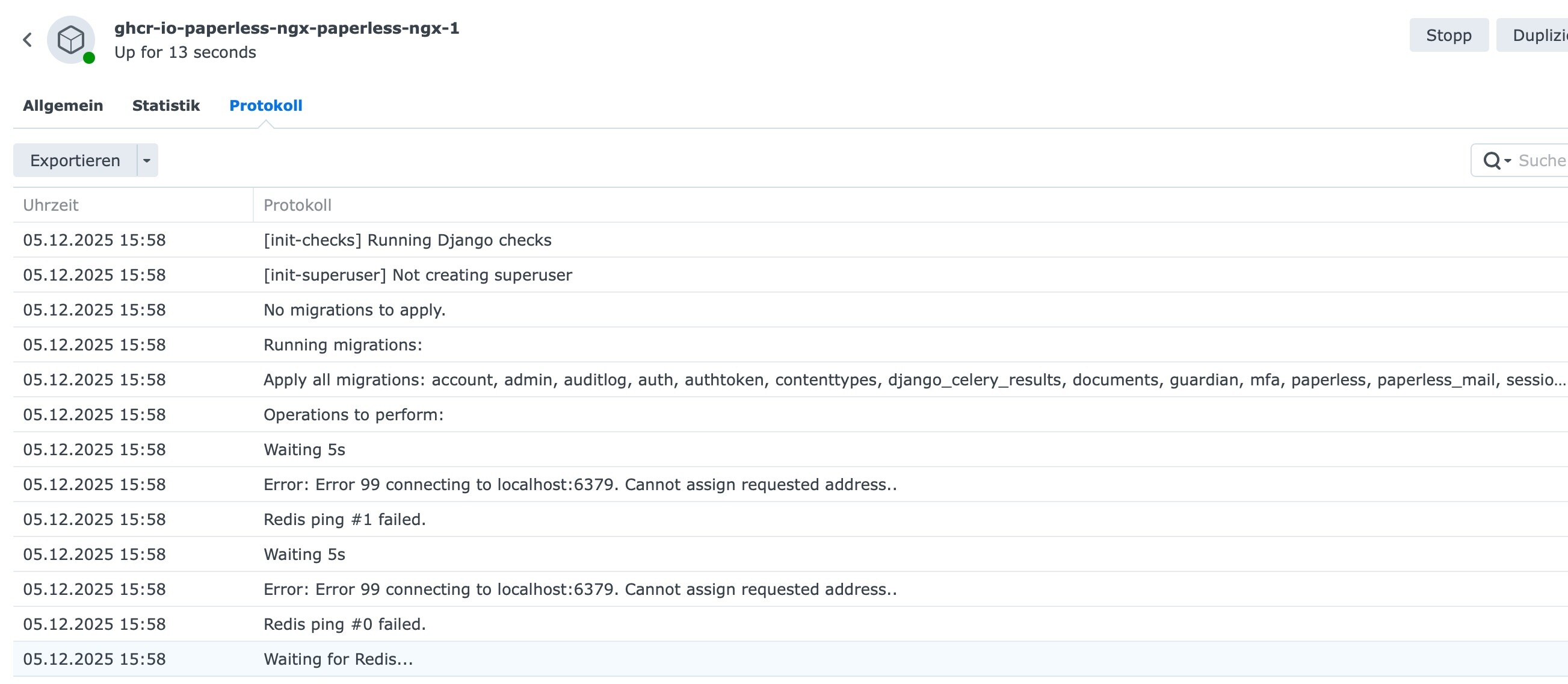 Trotzdem werden die beiden container “postgres” und “ghcr-io-paperless-ngx“ nach wenigen Sekunden beendet.