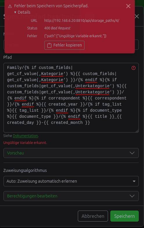Hey, danke für deine Vorlage!!! Ich habe die so in den Speicherpfad kopiert, bekomme leider den Fehlercode 400 “unbekannte Variable”. Was hab ich übersehen?