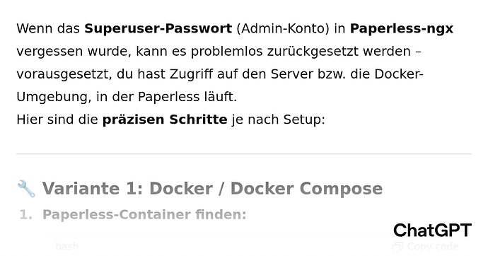 gibt es dir Möglichkeit bei Paperless-ngx ein neues Passwort zu vergeben? Ich habe es leider vergessen und komme nicht an meine Daten ran. Bin gerade dabei mir alled einzurichten. Habe das voriges Jahr schon begonnen und muss nun wirklich einen vernünftigen Workflow erstellen.