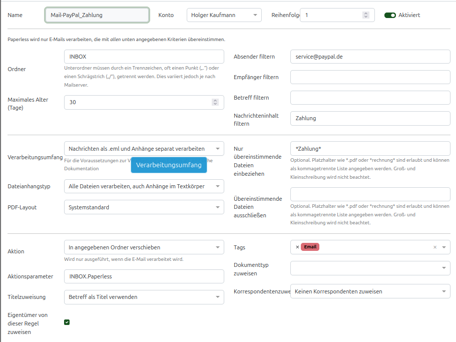 Bei mir werden nur ein Teil der Mails abgearbeitet. Es wird im Posteingang gesucht und wenn meine Regel zutrifft in paperless übernommen und in einen Ordner unter Posteingang geschoben. Es werden keine Änderungen am Dateinamen gemacht. Als Test habe ich eine spezielle Mail-Regel nur für eine Mail gemacht funktioniert nicht.