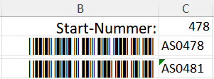 Statt QR-Codes verwende ich Code-39-Strichcode-Labels. In MS-Word kann so ein Strichcode mittels {DISPLAYBARCODE „ASN0001“ CODE39 \D} erzeugt werden (\D für Start und Stop). Excel hat leider noch keine geeignete Funktion. Da geht es aber, wenn ein Code-39-Font (z.B. von Free Code 39 Barcode Font [100% Free]) auf dem Rechner installiert wird: Wenn die Zelle C2 den gewünschten Label-Text (z.B. AS0478) enthält, ergibt z.B. die Zelle B2 mit ="("&C2&")" auf den Code-39-Font eingestellt, den gewünschten Strichcode. Je nach Font-Hersteller kann für Start und Stop auch statt der Klammern ein anderes Zeichen notwendig sein. Mit Schriftgröße und Zeilenhöhe habe ich es mir so formatiert, wie im Bild gezeigt. Zum Ausdrucken verwende ich Bogen mit großen Labels und schneide nach dem Ausdruck schmale Steifen (einzelne Zeilen) ab, die ich mir bereitlege.