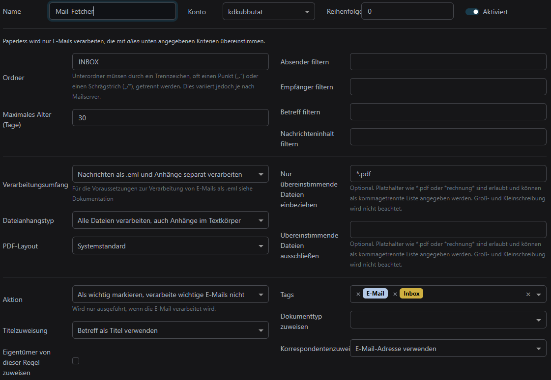Hab gelesen, er kann Nachrichten als .eml verarbeiten. Das geht aber nur mit Tika und Gotenberg. Paperless wird dann also sowohl das PDF als auch die Nachricht an sich (E-Mail) in Paperless importieren.