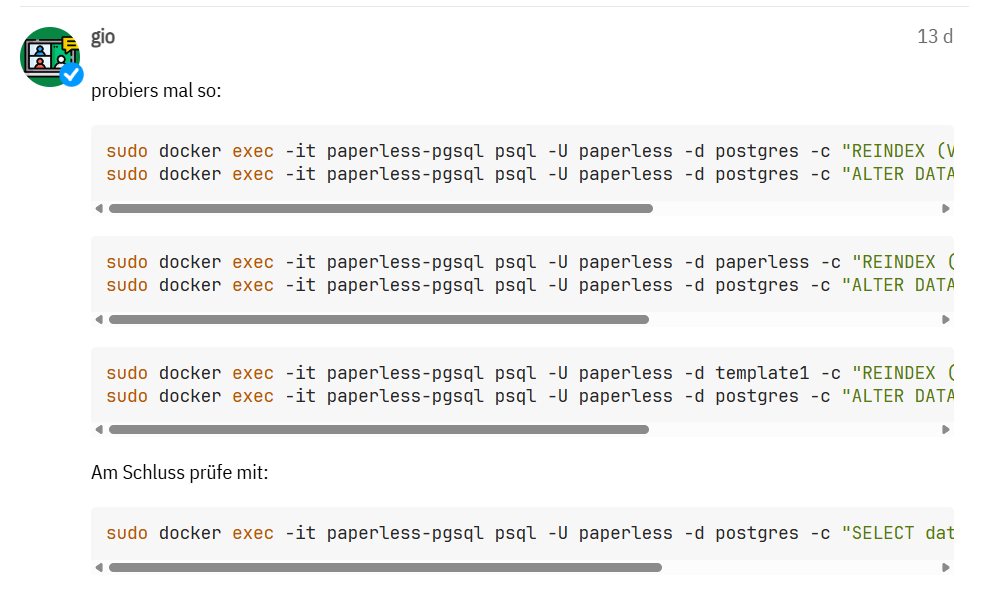 ~$ sudo docker exec -it paperless-db-1 psql -U paperless -d postgres -c „REINDEX DATABASE template1;“