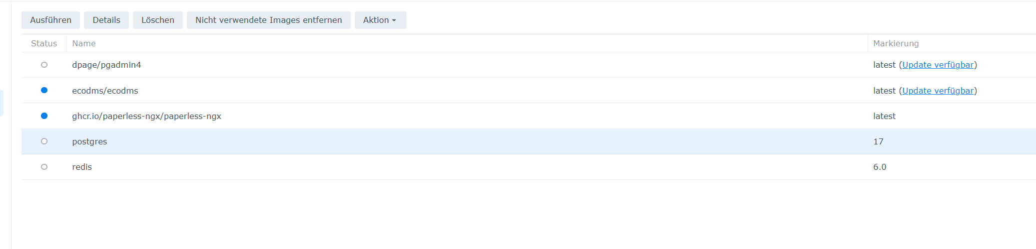 Laut meines YAML, habe ich Postgres 17 installiert und am laufen, was mich nur wundert, das ich in der Synology Postgres und Redis gar nicht laufen bzw. sind nicht blau, was im Umkehrschluss heißt das Sie nicht laufen, kann das sein?