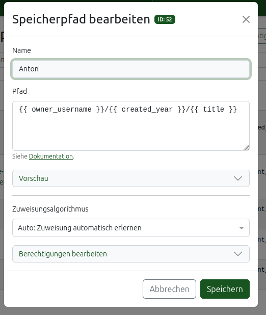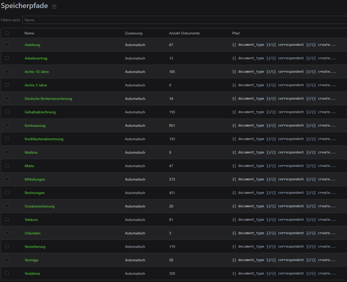ein Speicherpfad anlegen und unter Pfad : {{ document_type }}/{{ correspondent}}/{{ created_year }}//{{ title }}
